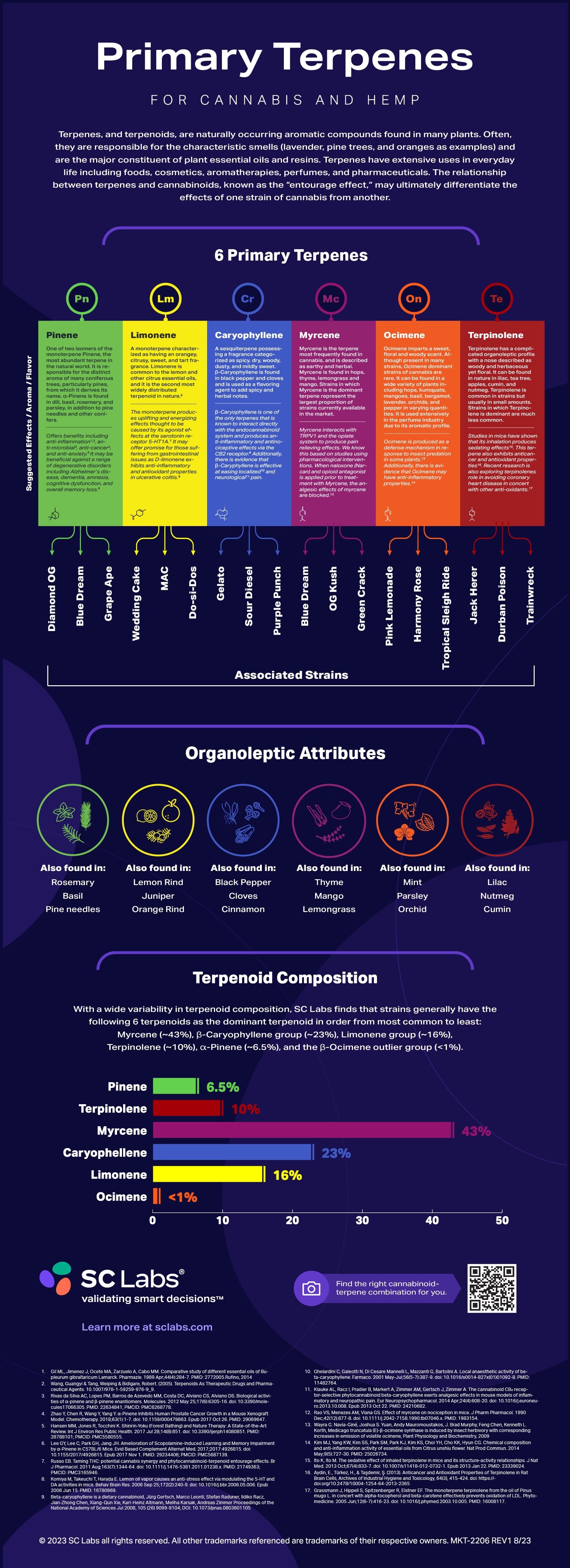 That’s why we’re excited to share this new infographic created by our trusted lab partner, SC Labs. It breaks down six of the most common primary terpenes found in cannabis and hemp, including where else they show up in nature, what they might do, and which strains they’re typically associated with. Whether you're just beginning to explore the world of terpenes or you’re already seeking specific profiles for specific outcomes, this is a great reference tool to help guide your journey.