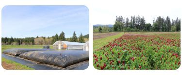 Northwest Oregon delivers generous rainfall each winter, and we capture all that we can. Our water collection system stores 60,000 gallons total across two 25,000-gallon field bladders, two 2,500-gallon greenhouse tanks, and one 5,000-gallon main reservoir.